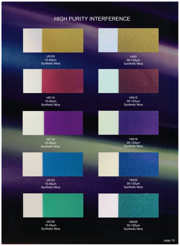 - Composition: Typically made from mica coated with metal oxides (like titanium dioxide or iron oxide), making it non-toxic and safe.